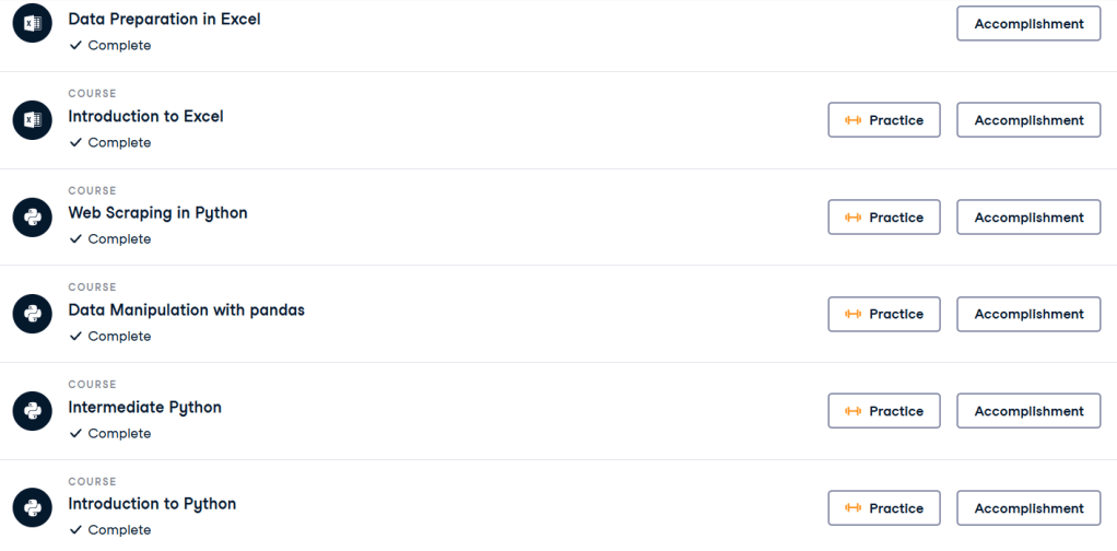 Afin de découvrir, les technologies utilisées dans le domaine de la data, j’ai souscrit à un programme en ligne appellé DataCamp https://www.datacamp.com/. Ici, j’ai pu améliorer mes compétences tels que :